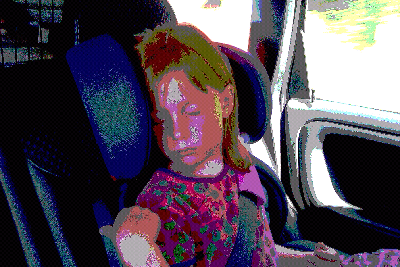 På väg i bilen, Nova sover sött. Förhoppningsvis kan vi sträckköra hela vägen.